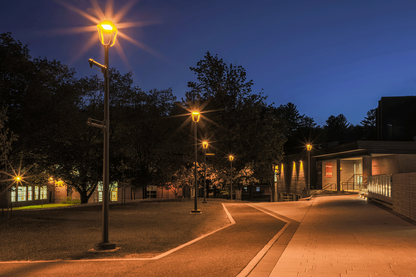 Svetiljke su opremljene ambara LED diodama (1.800K) kao podsećanje na istorijsko ulično osvetljenje i u cilju stvaranja prijatnog prostora gde se učenici i osoblje mogu bezbedno kretati po mraku, uz minimalnu potrošnju energije. Ambar boja LED dioda takođe proizvodi manje odsjaja na nebu i manje ometa divlje životinje, tako da je to bilo pobedničko rešenje za sve.